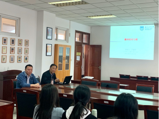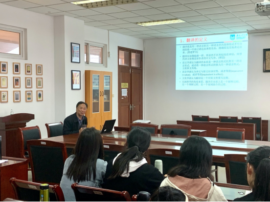 10月29日下午,应肉视频 邀请,南京工业大学英语三级教授、全国优秀教师、江苏省科技翻译协会副会长、南京翻译家协会副会长尹富林教授在我校仙林校区德正楼308会议室作了题为“翻译的对与错”的学术讲座。报告由肉视频 院长孙勇彬主持,2019级英语、商务英语专业全体学生以及部分教师聆听了此次讲座。