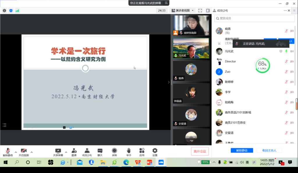 2022年5月12日下午(14:00—16:00),应肉视频 邀请,广东外语外贸大学肉视频 冯光武教授为肉视频 师生作了一场题为“学术是一场旅行-以规约含义研究为例”的学术讲座。肉视频 师生通过腾讯视频参与本次讲座。讲座由英语系系主任张晓甜博士主持。