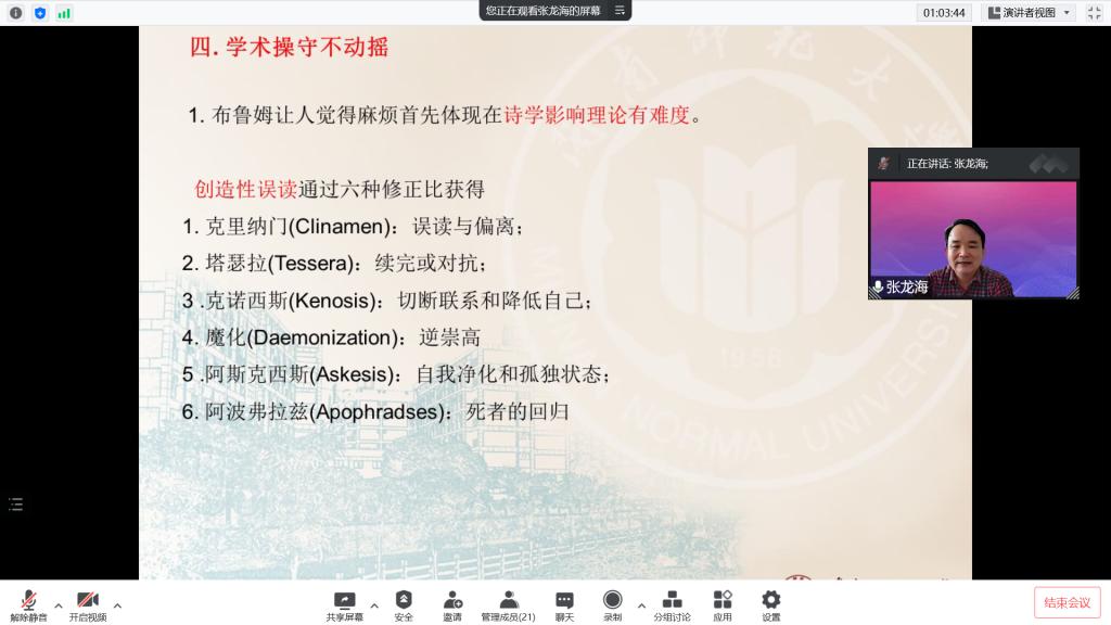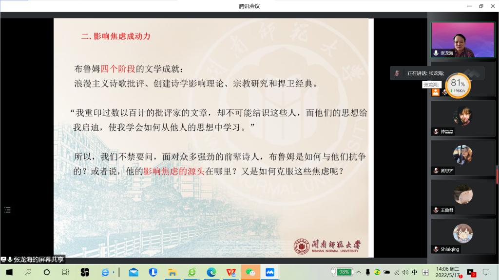 2022年5月17日下午(14:00—16:00),应肉视频 邀请,闽南师范大学副校长张龙海教授为肉视频 师生作了一场题为“哈罗德•布鲁姆文学遗产”的学术讲座。肉视频 师生通过腾讯视频参与本次讲座。讲座由院长助理顾晓燕博士主持。