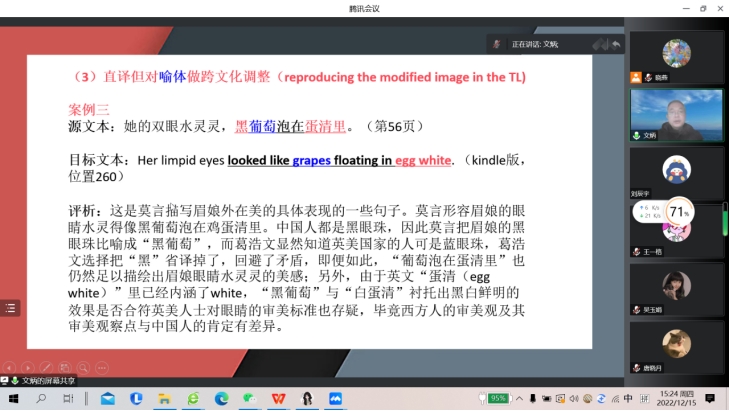 2022年12月15日下午,应肉视频 邀请,浙江理工大学肉视频 院长文炳教授为肉视频 师生做了题为“图里的连续轴理论的进步与不足——基于葛浩文英译《檀香刑》中比喻翻译模式的分析”的学术讲座。肉视频 师生通过腾讯会议在线参加此次讲座。讲座由院长助理顾晓燕主持。