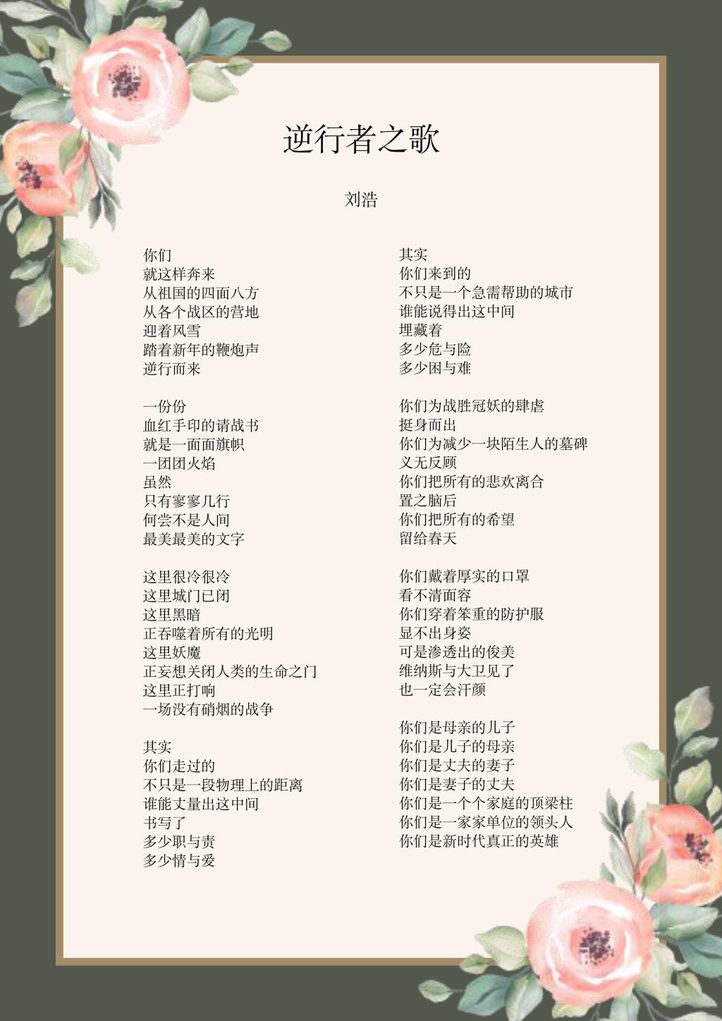学院党委书记刘浩感动于“逆行者”的无畏奉献,创作原创诗歌《逆行者之歌》,歌颂他们不畏艰险、为大爱舍弃小爱的无私精神,传递社会正能量。诗歌写到:“你们为战胜冠妖的肆虐挺身而出,你们为减少一块陌生人的墓碑义无反顾,你们把所有的悲欢离合置之脑后,你们把所有的希望留给春天。”