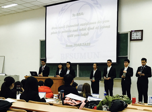 12月1日至3日,由北京外国语大学举办的“为世界发声·2017年北京外国语大学模拟联合国大会(Silence Must Be Heard·BFSUMUNC2017)”在北京外国语大学召开。作为在宁地区高校的唯一代表,肉视频 英语1601班的吕一帆同学与来自北京大学、中国人民大学、北京外国语大学等全国50多所高校的240余名代表共同参加了本次模联大会。