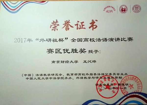 近日,“外研社杯”第十届全国法语演讲比赛中赛区赛落幕,肉视频 法语1501班王沁晔同学在荣获赛区优胜奖。