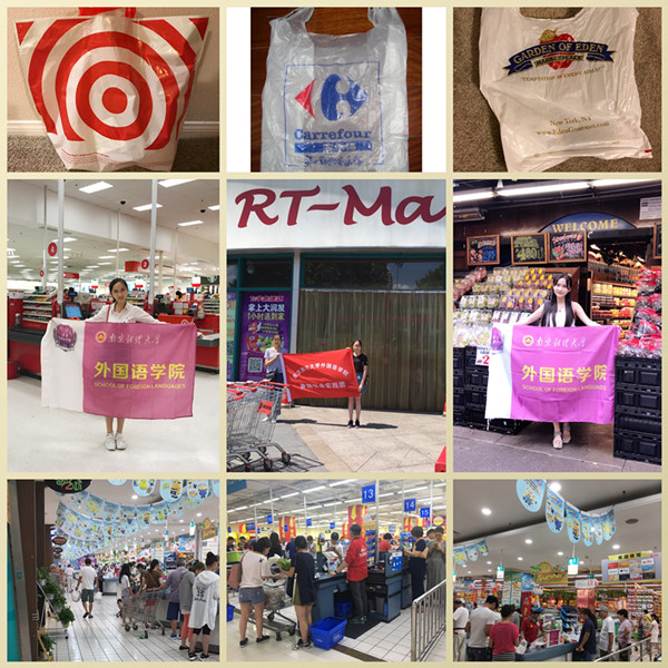 该团队走访了南京、无锡、常州、上海、贵阳等地的苏果、欧尚、乐购、大润发、沃尔玛、永辉、家乐福、金鹰超市等具有代表性的大小超市。苏果超市收银台仅出售塑料购物袋,欧尚超市出售的购物袋则分为布袋和可降解塑料袋两种。欧尚超市的工作人员说:“早上老年人较多,基本自带塑料袋,节假日超市购物布袋销量会增加。”但是71%的顾客表示他们并不会购买超市提供的布袋。有超市工作人员透露,很多消费者会买两个小的塑料袋而不是一个大的布袋,这样能省几角钱。调查团队成员还发现超过一半年轻人不会自备购物袋,老人家只有在随身带的布袋不够装了时才会应急购置塑料袋。