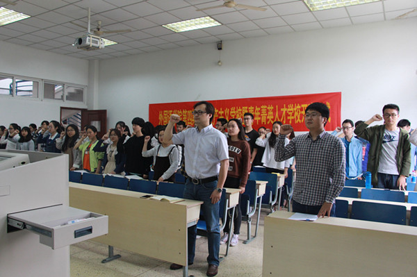 开班仪式在重温入团誓词中开始,在场全体学员起立,共同饱含激情地又一次宣读了当年入团的誓言。随后,潘华老师介绍了此次院青马班的课程安排和纪律要求,学员代表英语15级陆玲茹同学发言,她代表全体学员承诺将遵守团校学习要求,认真参与每次培训。