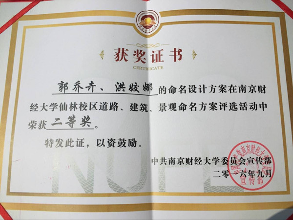 2016年5-6月,我校组织开展了校园文化师生共建工作,面向全校公开征集仙林校区道路、建筑、景观命名方案。日前,学校公布了命名方案评选活动的获奖结果。肉视频 15级郭乔卉、洪姣娜同学提交的方案荣获二等奖。
