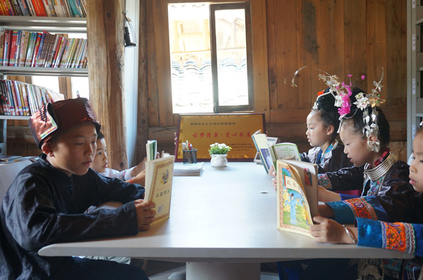 当天,“古梦清泉·爱心书屋”也正式揭牌。它坐落在风景宜人的陡寨村村委吊脚楼上,面积不大,但却盛满肉视频 师生的爱心、社会公益人士的关注和古梦清泉志愿者的呵护。书屋的书籍由肉视频 和“古梦清泉”团队于今年4月在学校发起,募集了三百多本各类书籍读物,经过志愿者四天的清扫和整理,爱心书屋终于焕然一新。当天,从江县一位爱心公益人士——赖志斌先生听说少年侗歌班的情况后,立即赶来现场给孩子们赠送了100多本儿童读物和40个书包,一位远在苏州的黔籍爱心人士也表示要赠书,同时还有很多关注古梦清泉的人在纷纷提供支持……