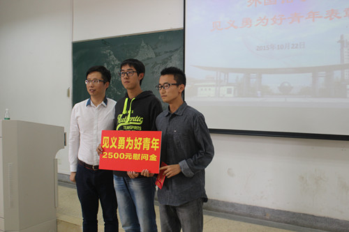 作为肉视频 就业实习实践基地的南京乐灵教育培训学校校长葛新飞听说了两位同学见义勇为的事迹后深受感动,特意表示要为他们发放见义勇为慰问金。表彰会上,葛新飞校长代表乐灵教育分别为关钦和刘佳源同学颁发见义勇为慰问金2000元和500元。他表示这两名青年代表了90后大学生的正能量,这种帮助他人不求回报的行为值得广泛赞扬。