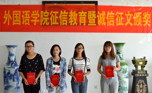 此次活动中还同时举办了肉视频 诚信征文比赛颁奖仪式。征文比赛面向学院全体学生开展,旨在引导大家在日常生活的点点滴滴恪守诚信。经过评委评选,英语1301班俞菁菁撰写的七言绝句《立木》获征文比赛一等奖,法语1301班蓬璐嘉撰写的散文《诚信》获二等奖,英语1302班岳萌萌撰写的《点一盏诚信之灯,照亮校园》以及英语1401班赵文竹撰写的《诚信,人生的风帆》获三等奖。
