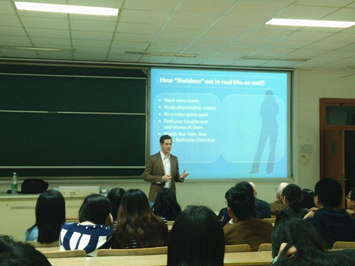 4月16日晚6点半,第三期中西文化论坛活动在教c108举行,本期的主讲老师是Matthew Malkmes。Matthew以一个问题“How 'Sheldons' act in real life , or not ?!”引出话题。他提到谢尔顿体质的人在实际生活当中的表现主要归位以下几点:读漫画书、学习物理以及其他学科、找到坐着舒服的位置、表现的比平常人更优越,而且此类人从不喝酒、吸毒以及说脏话,他们总是避免与人的身体接触,也会学各种各样的语言,和平常人吃一样的食物。Matthew还举了几个有谢尔顿代表特征的人物,如霍金以及爱因斯坦。同时他提到男性具有谢尔顿特征的较多,也阐述了原因。诸如:男性比女性天生好斗;男生较注重自身身体素质的锻炼和提升。