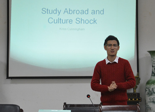 11月12日晚,金阳光出国留学集团留学专家Kriss Cunningham和Francis Dang(党巍杰)应邀为肉视频 的同学们做了有关东西方文化差异与留学经验的分享讲座。讲座在法政学科楼308会议室举行。