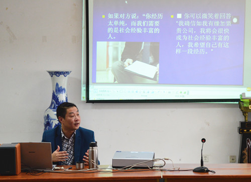 随后,周强先生结合外语专业人才需求,对如何做一份独特的简历和如何从容顺利地应对面试提出了建议。他提议,简历应简洁明了,措辞准确。在面试过程中,对肉视频的了解和对企业的忠诚度、强烈的归属感等内容也十分重要。周强先生还为大家讲解了一系列面试中经常出现的陷阱题和面试中的细节问题。