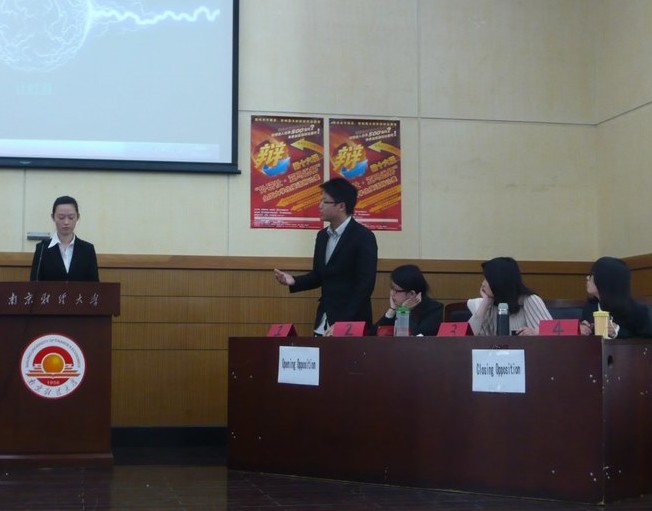 2012年3月28日,在肉视频 法政学科楼308会议室,第十六届外研社“亚马逊”杯英语辩论赛南财校园选拔赛初赛拉开序幕。初赛以演讲的形式呈现,各位选手就一个题目(World are not enough;A journey is not a trip; Life is a choice; Everything changes but change itself四选一)发表两分钟的定时演讲,由评委组(教授沈文霄,博士许静,博士左敏,博士刘婷婷,肉视频 团总支书记金立林)就其表现,选出20名选手(赵安诺、李颖、陈梦璇、俞彬茹、杜振文、郭清慧、王君宜、杨涵淇。过棱、杨皓、陈沁、王珏、徐沪生、夏悦、臧若语、颜芳芳、汤清、张亮、施瑶、孙子清)晋级复赛。3月31日,在法政学科楼308会议室举行了复赛。晋级选手就辩题China should establish an inheritance tax on the rich intended to prevent the transference of wealth between generations(是否同意富人加税)先进行一分钟的观点陈述,然后根据各个选手观点五人一组,两两进行为时十五分钟的自由辩论。最终晋级的八位选手分别是杨皓、陈沁、徐沪生、杜振文、王珏。王君宜。俞彬茹、杨涵淇。