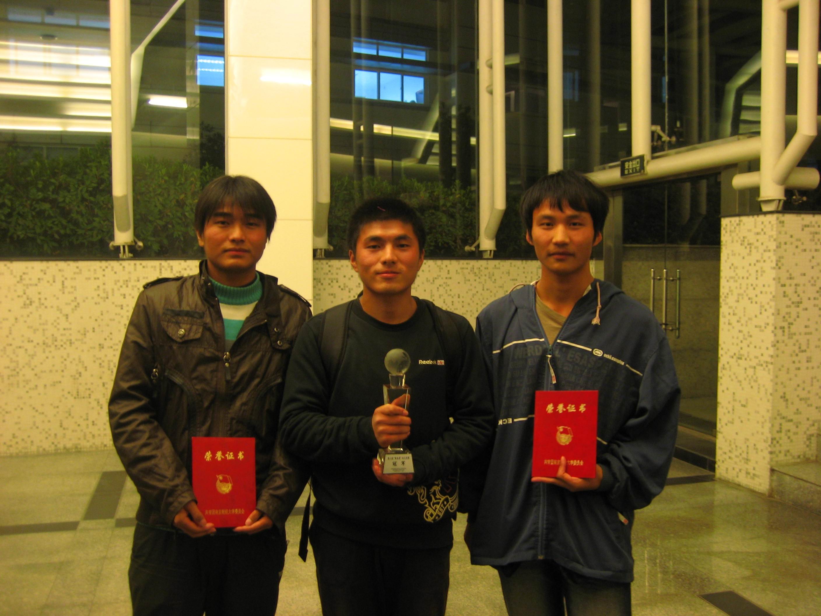 该次决赛共分三个环节:经济类必答题、描述改错题、抢答题与限时问答题。金融学院、国际经贸学院于前三个环节稳占前一、二两名,外语系紧追其后,为第三名。在最后的限时问答题中,外语系答对六题,领先答对四题的金融学院,勇夺桂冠。国贸与金融分别为第二、三名。我系冯雷森等同学获得“智多星”称号,校学生会副主席为他们颁发了奖品及荣誉证书。