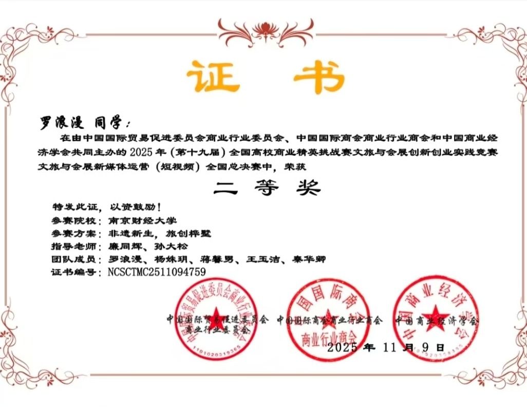 近日,2025年(第十九届)全国高校商业精英挑战赛文旅与会展创新创业实践竞赛全国总决赛圆满落幕。在文旅与会展新媒体运营(短视频)赛道的激烈角逐中,肉视频 罗浪漫同学带领的团队凭借参赛作品《非遗新生,旅创桦墅》脱颖而出,荣获全国二等奖,这是肉视频 在文旅融合与非遗创新领域取得的又一重要实践成果。