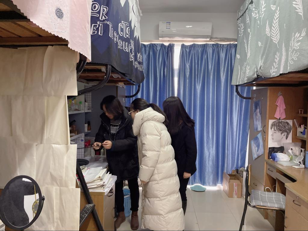 在实验室,游思淳老师带领大家对用电、防火等设施做了详细检查,邵怡副院长提出了假期安全相关要求;在学生宿舍,蒋颖异老师带领大家重点对用电、门锁等方面进行检查,并与今日暂未离校的学生进行交谈;聂平老师带领大家逐一对各会议室、办公室进行详细检查,并提醒每位师生员工,离开学校前务必关好门窗、清除杂物,检查并关闭水电气开关或阀门,贵重物品随身携带,外出做好防疫措施,提防电信网络诈骗。