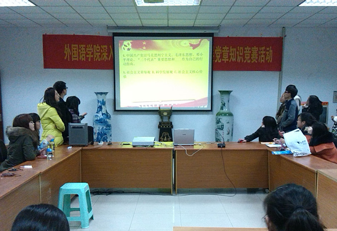 晚上六点半,关于党的十八大的知识竞赛在肉视频 会议室如期举行。来自大一、大二、大三和研一的各位同学在赛场上尽情发挥,对答如流,对党的方方面面有着深刻到位的理解。最后以研一的学长学姐获得了一等奖而圆满告终。