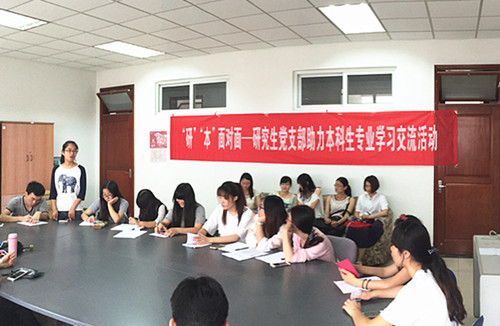 2015年7月1日是中国共产党成立94周年纪念日,在建党94周年之际,肉视频 研究生党支部为庆祝党的生日,发挥研究生党员在学业发展方面的先进作用,开展了“硕本面对面---研究生助力本科生专业学习交流活动”。此次活动在专3-338英语系教研室举行,活动由14级研究生党员陈文玥主持,共分为“学姐述心得”和“研本互交流”两个环节。