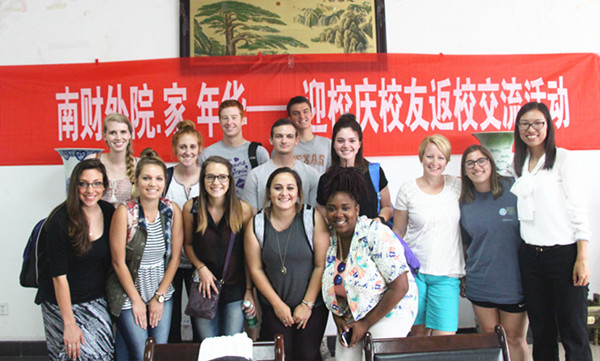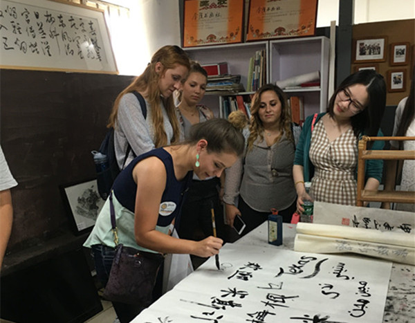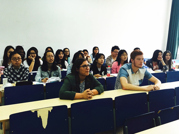 在校期间,美国大学生们在校国际合作与交流处和肉视频 师生的带领下参观了校园,在大学生活动中心与金陵书画社的同学们一同感受中国书法的魅力,在体育馆观摩了专业羽毛球运动员的练习。还参与了学院的外文百科知识竞赛、英语演讲比赛、心理健康素质拓展等第二课堂活动。交流期间,应肉视频 邀请,该校助理教授、我校英语021班校友许婷婷开设讲座与学弟学妹分享了自己海外十年的学习和工作感悟。