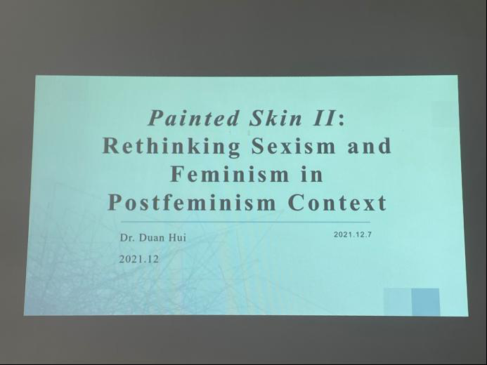 段慧老师以电影《画皮》为例,讲解了后女性主义时代男性凝视下的电影机制,强调消费文化对女性的构建。主要讲述了该电影中两位表现出不同气质的女性角色相互救赎的故事,一位是符合男性审美的柔弱的女性气质,而另一位则是阳刚的男性气质。其中特别提到,该电影中男主角表现出的俄狄浦斯情结,分析了其产生原因,体现了电影中男性人物在国家和爱情面前的犹豫和怯懦。