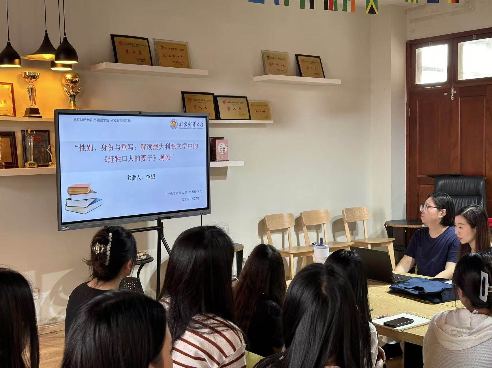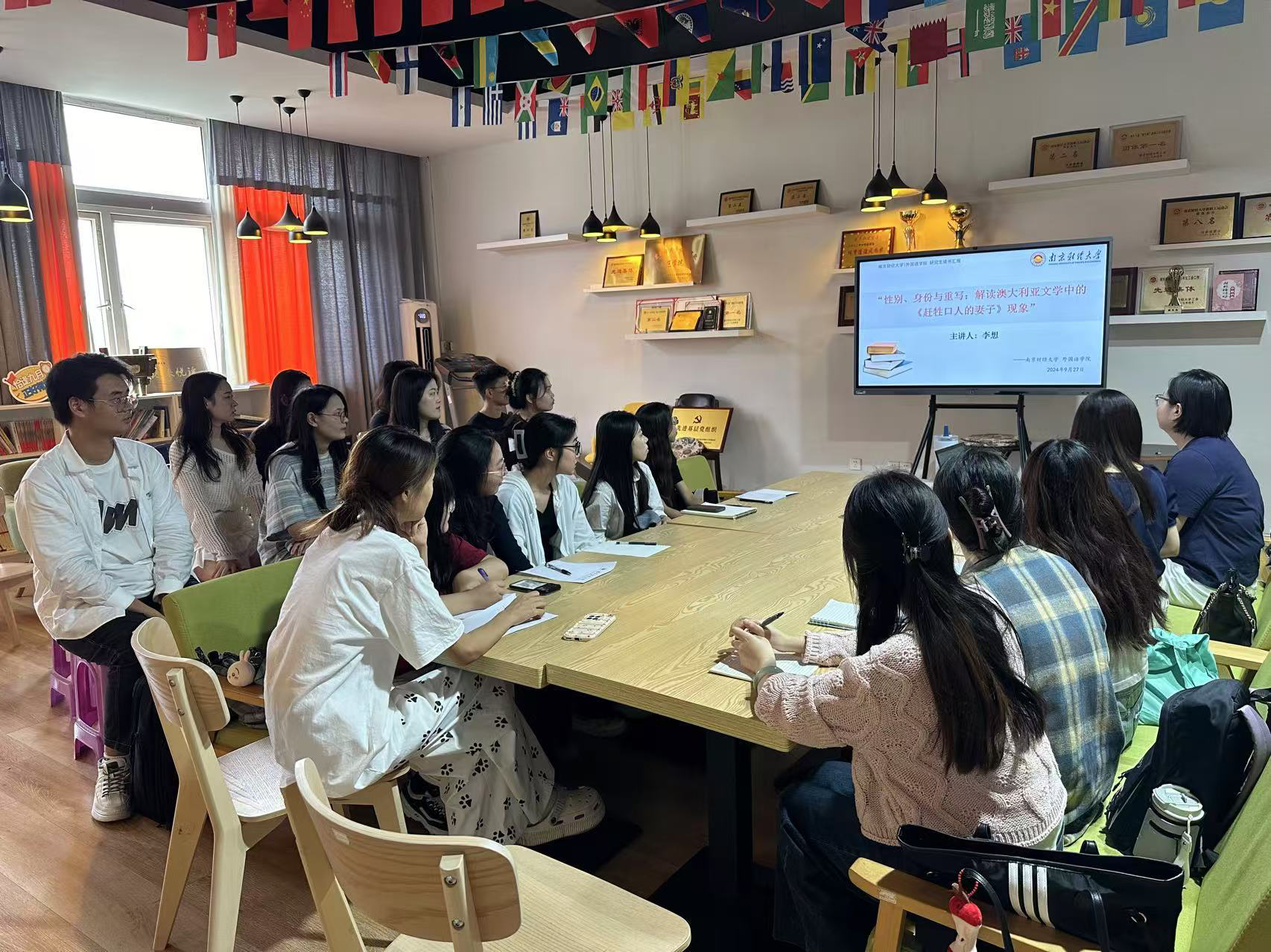 2024年9月25日下午,肉视频 在德正楼304室成功举办了第十六期众书读书会。李想老师为肉视频 师生带来了题为“性别、身份与重写——解读澳大利亚文学中的《赶牲口人的妻子》现象”的精彩学术讲座。出席此次活动的有肉视频 22、23、24级研究生,本次读书会由研究生党支部书记王云姣老师主持。