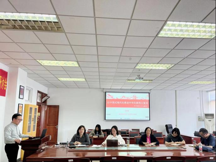 5月11日下午,肉视频 在德正楼308会议室开展学习贯彻习近平新时代中国特色社会主义思想主题教育读书班专题讲座。马克思主义学院杨荣刚老师围绕“以中国式现代化推进中华民族伟大复兴”作报告。院党委全体成员、党支部书记参加学习。全体党员在线上聆听报告。讲座由院党委书记李骏主持。