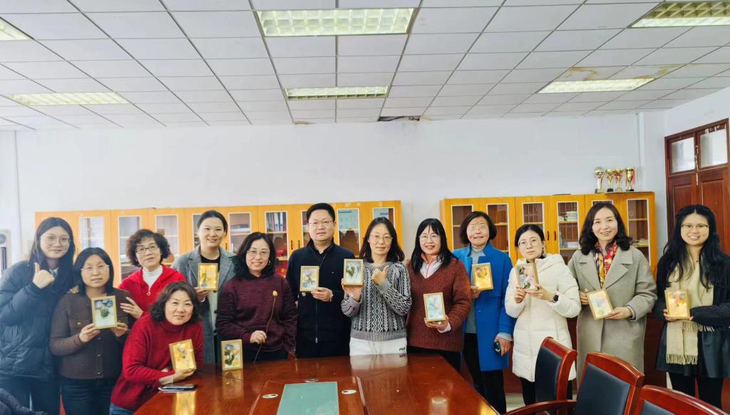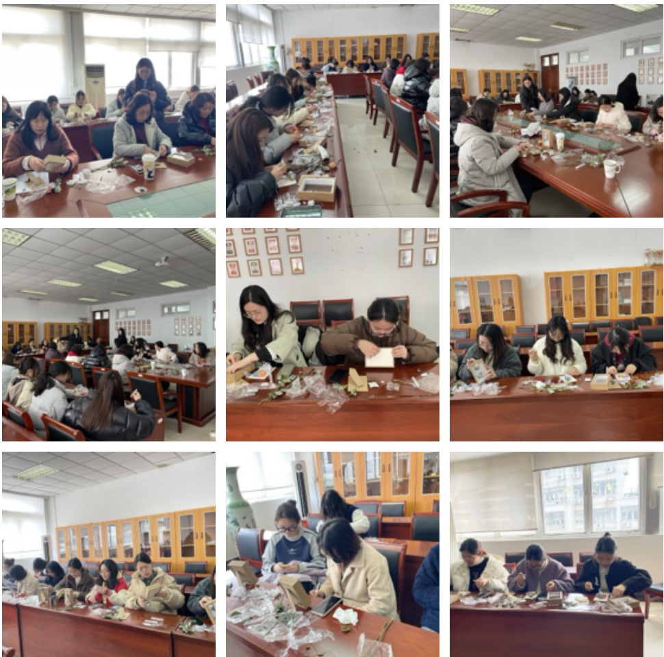 书记李骏、院长丁强、副书记刘璐、工会主席李丽萍、宁波银行客户经理杨阳等部分教师和学生代表聚在一起制作永生花。