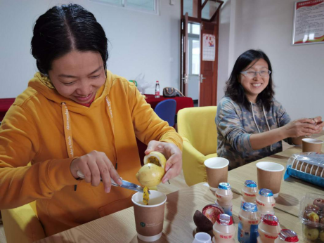 老师们收到百香果后非常激动,趁着运动会之机,外国语分工会主席解艳老师将大家召集到教工之家,一面为大家讲解百香果对健康的益处,一面亲手为大家DIY上一杯杯原汁原味的百香果饮。